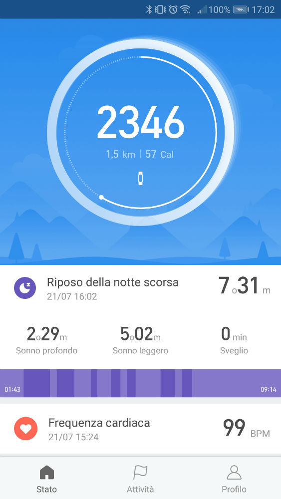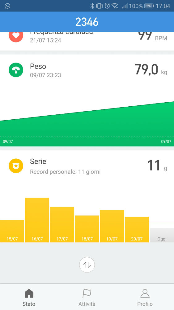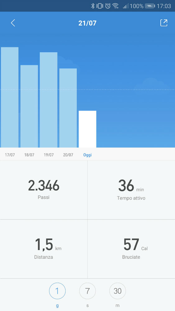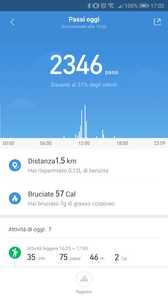 Ogni volta che aprirete l’app effettuerà la sincronizzazione automatica e potrete visualizzare così il numero di passi, i km percorsi, le calorie bruciate, il tutto suddiviso per orari, inoltre sono presenti dei grafici anche dei giorni passati.
