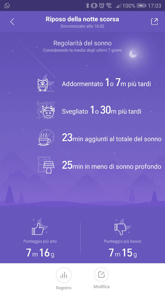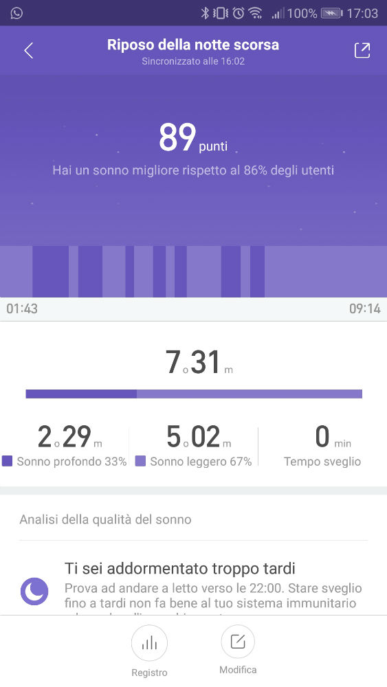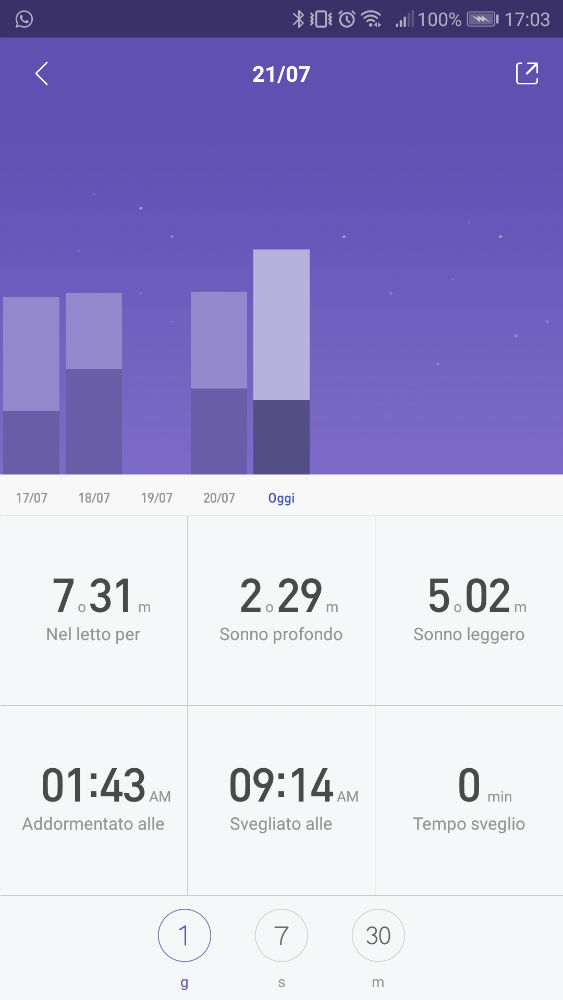 Sarà possibile visualizzare la qualità del sonno, infatti l’app vi mostrerà la durata totale del sonno, del sonno profondo, del sonno leggero, l’orario in cui vi siete addormentati, quando vi siete svegliati e quanto ci avete messo a risvegliarvi, il tutto visualizzabile anche tramite dei grafici per confrontarlo con i giorni passati.