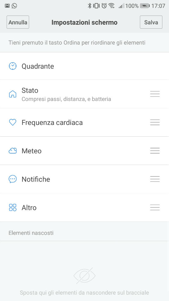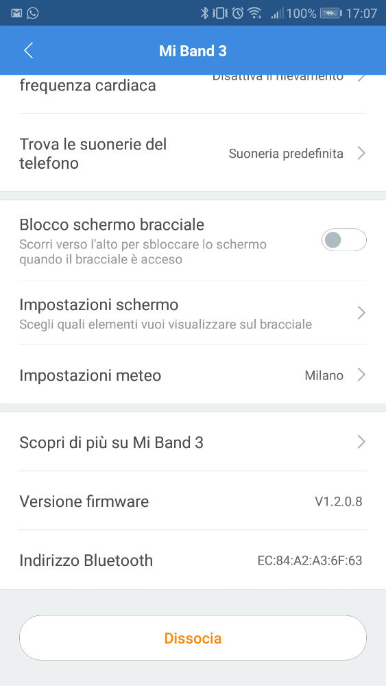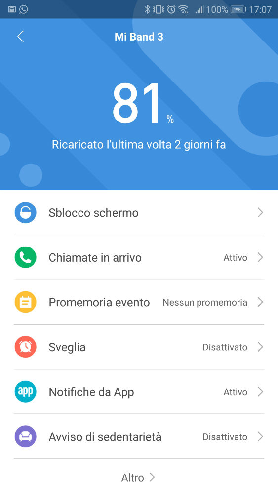 –Altro: per altre funzioni come il cronometro, modalità silenziosa, trovare il dispositivo, cambiare il tema della schermata principale di Mi Band 3 e informazioni sul firmware.