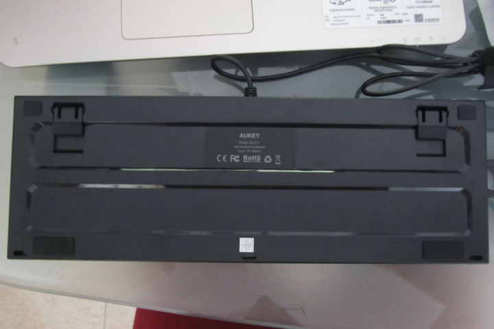 Sul retro sono presenti nella parte superiore due piedini che permettono di poterla tenere un po’ più sollevata, mentre nella parte inferiore sono presenti tre fori che, in caso di rovesci accidentali, permettono ai liquidi di defluire, proteggendo così la tastiera da eventuali danni.