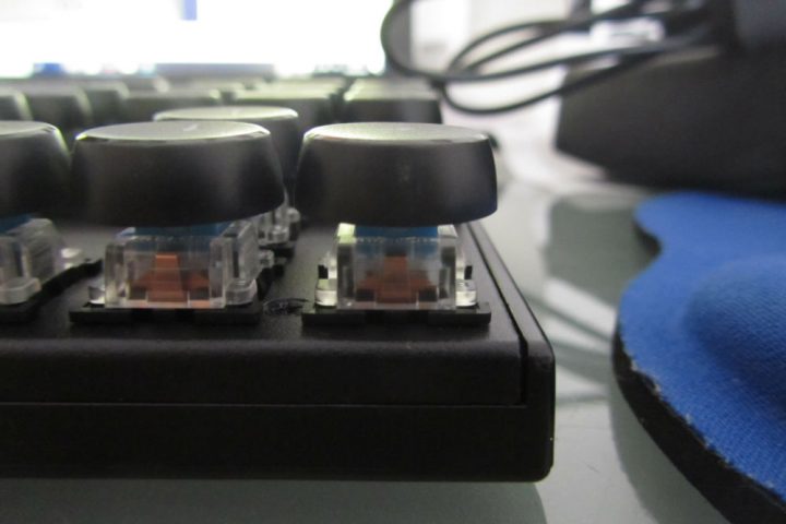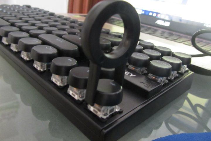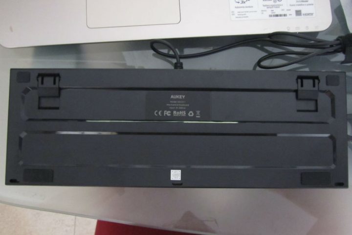 I tasti sono rotondi e ben distanziati tra di loro, hanno un ottimo feedback fisico, un po’ rumoroso, classico delle tastiere meccaniche, ma piacevole, ed è possibile scorgere sulla destra il logo AUKEY.