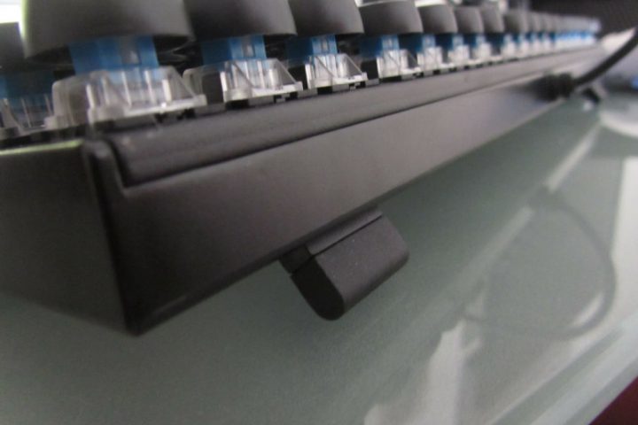 Sul retro sono presenti nella parte superiore due piedini che permettono di poterla tenere un po’ più sollevata, mentre nella parte inferiore sono presenti tre fori che, in caso di rovesci accidentali, permettono ai liquidi di defluire, proteggendo così la tastiera da eventuali danni.