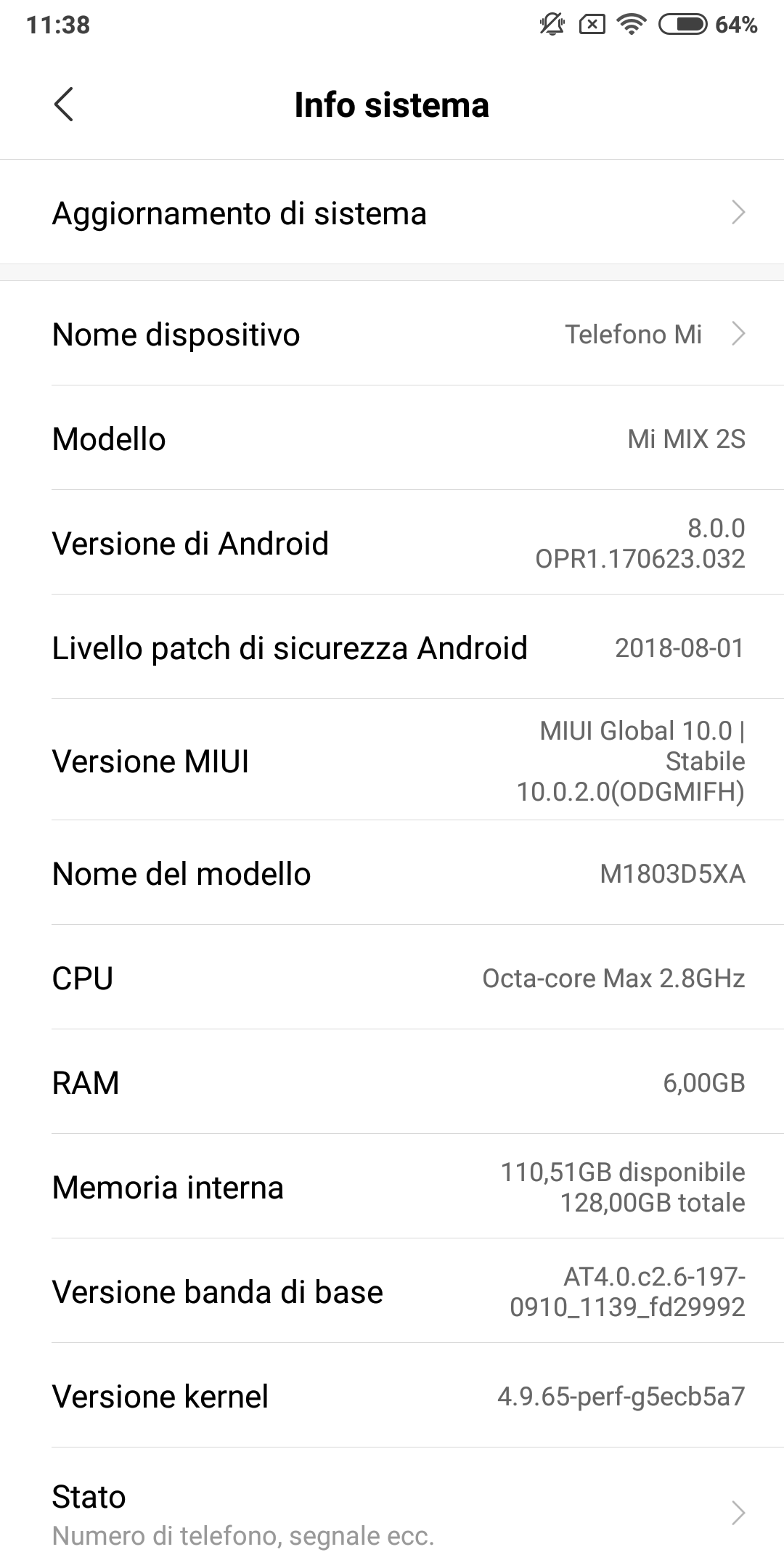 –Info sistema: con diverse informazioni sul telefono, come nome del modello, versione di Android, livello patch di sicurezza, versione di MIUI, CPU, RAM, memoria interna, banda di base, kernel e numero build, ed anche la possibilità di verificare l’uscita di nuovi aggiornamenti.