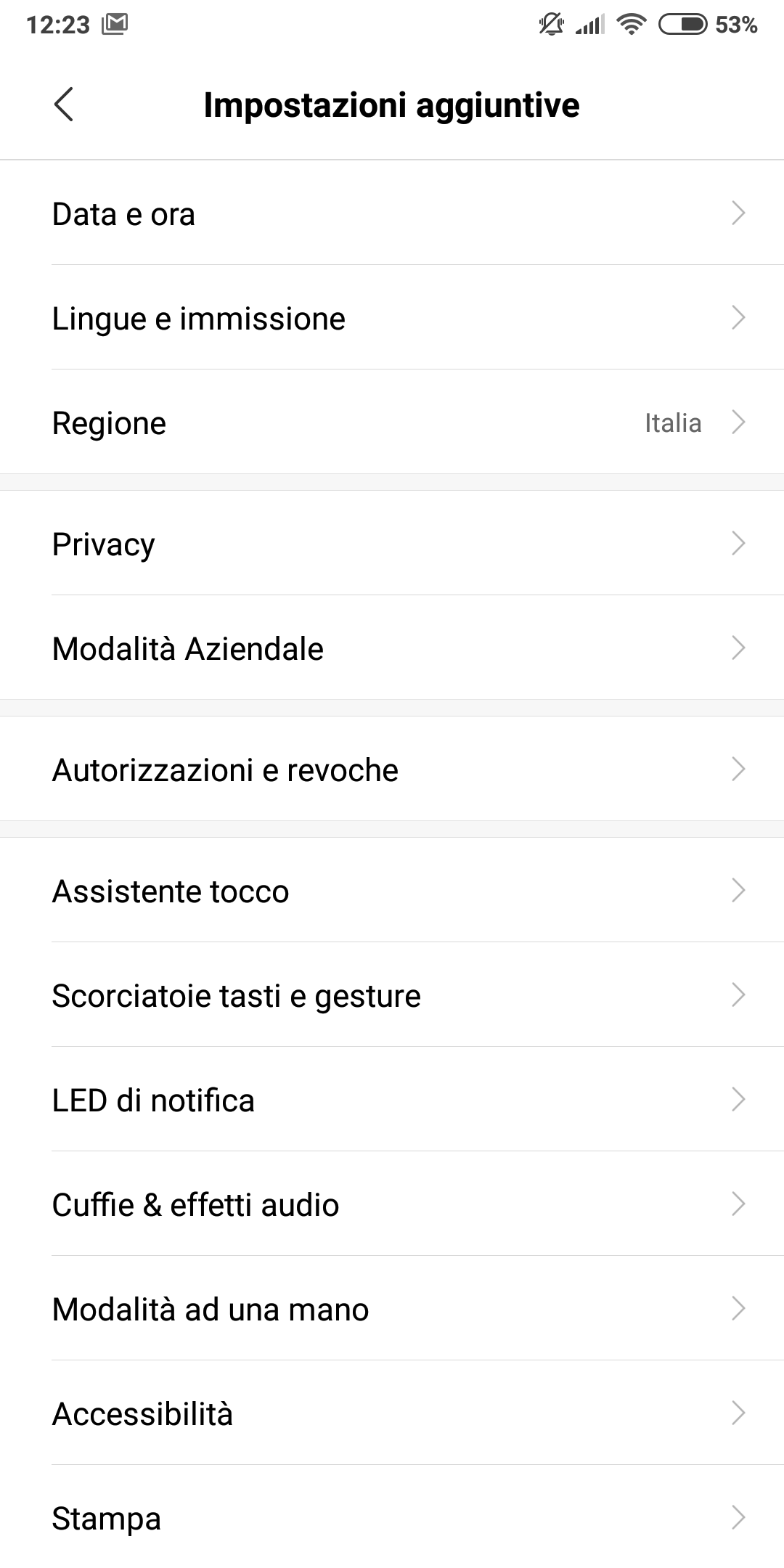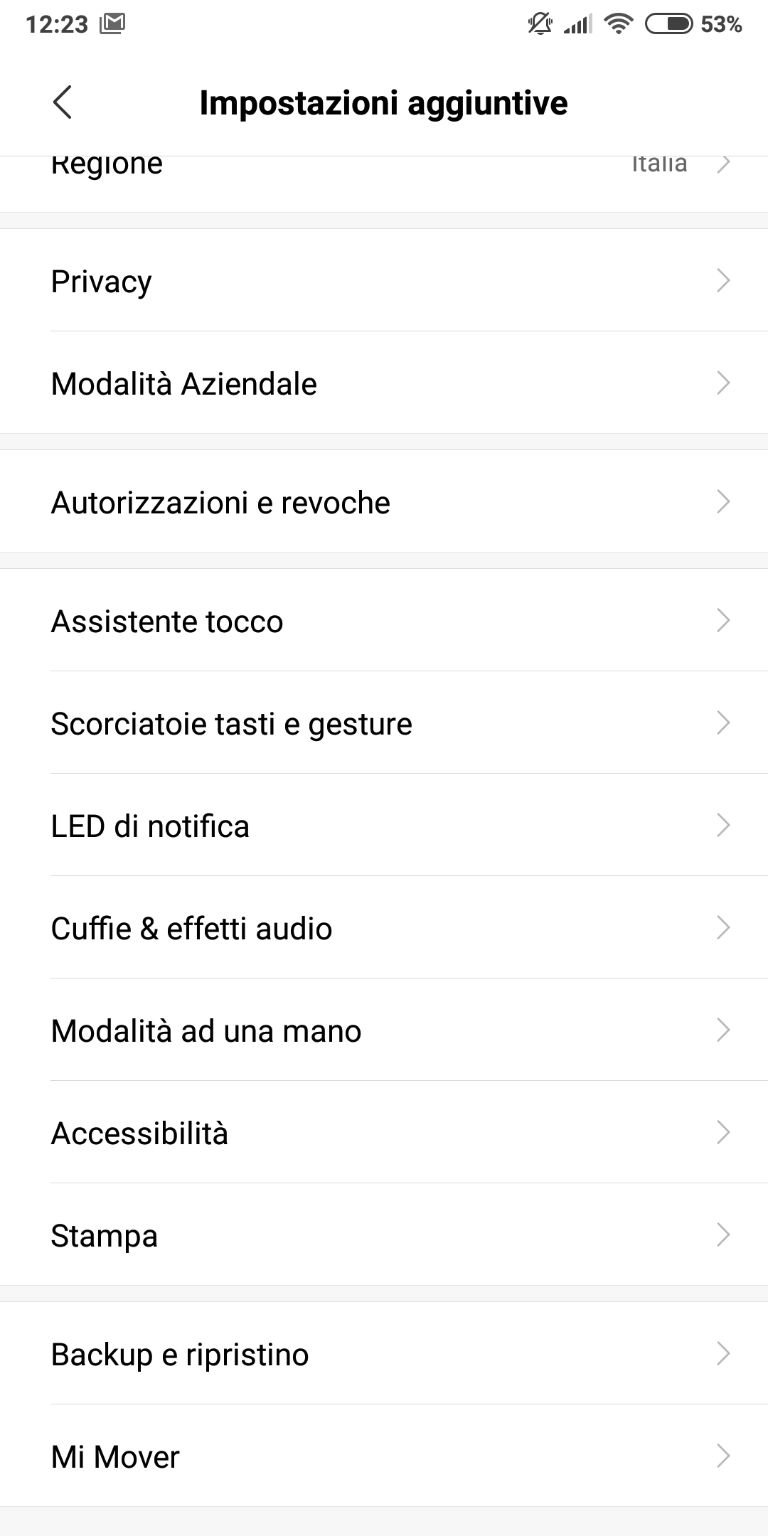 –Impostazioni aggiuntive: qui sono presenti delle utili impostazioni, come assistente tocco (per attivare un pulsante fluttuante in qualsiasi schermata e app , che comprende i pulsanti di navigazione, blocco schermo e screenshot), scorciatoie e tasti gesture, LED di notifica, assegnare determinate azioni ai pulsanti presenti sugli auricolari, migliorare il suono tramite equalizzatore e con Ottimizzazione Mi Sound, scegliendo il tipo di auricolari, tra generici ed alcuni modelli Mi, modalità ad una mano (per facilitare l’uso con una sola mano riducendo lo schermo a 3.5″, 4.0″ o 4.5″), effettuate un backup delle impostazioni e spostare dati da un dipositivo ad un altro tramite Mi Mover.