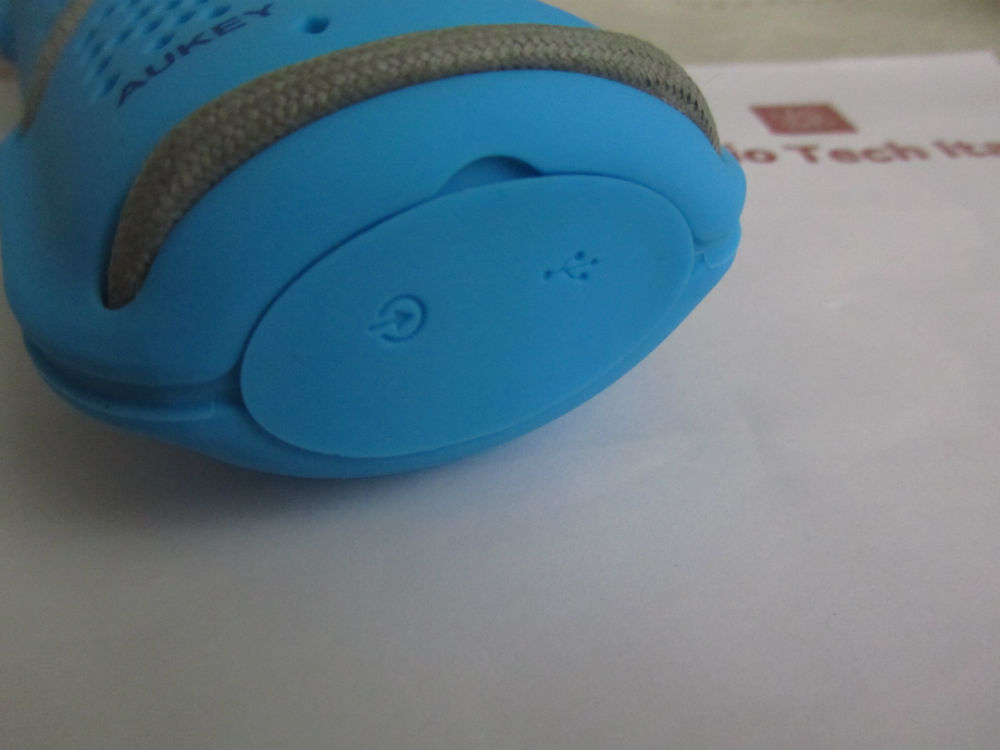 Nella parte frontale è presente il laccio regolabile, i pulsanti di accensione, volume -/traccia precedente, play/pausa e volume+/traccia successiva, la doppia cassa da 4.5W, il microfono, l’indicatore LED e il logo Aukey.