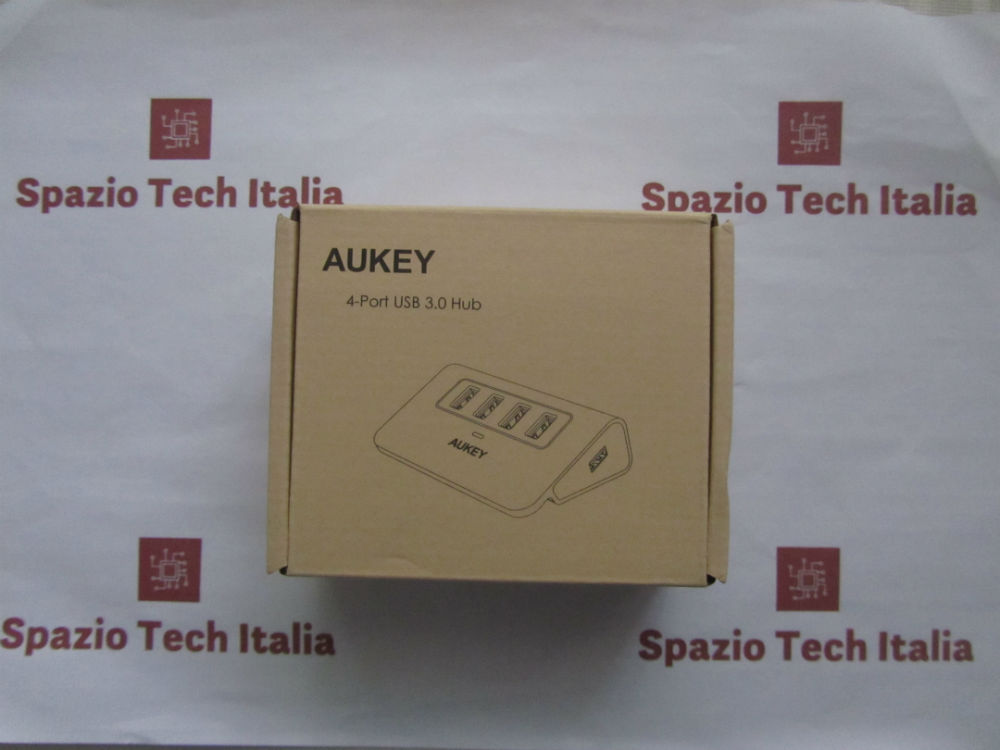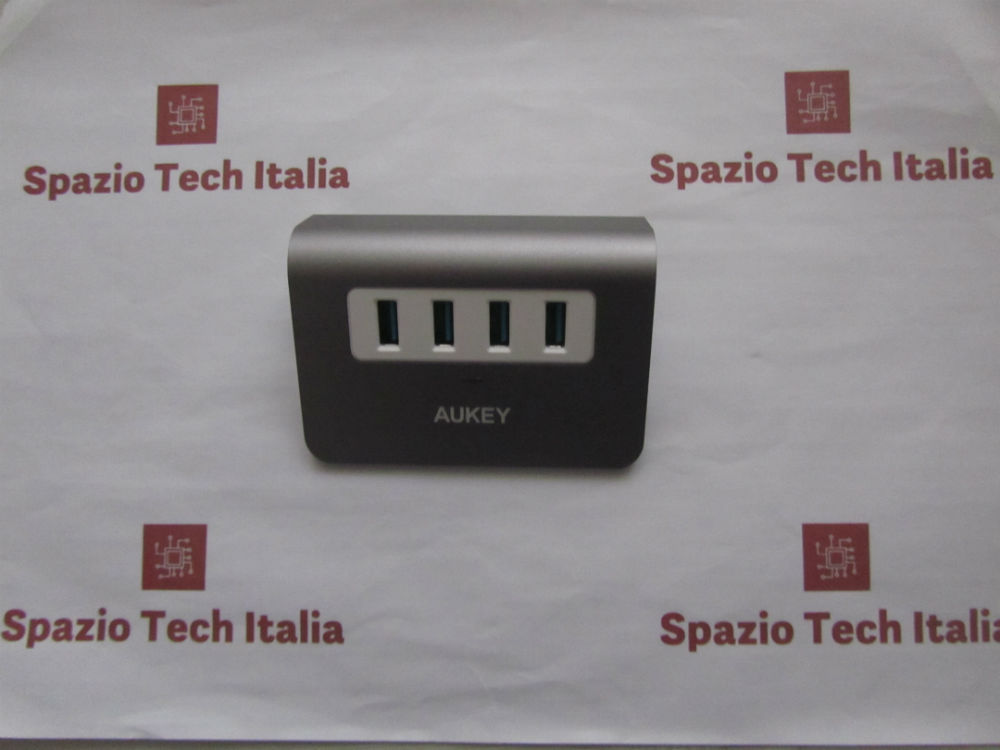 Sulla parte superiore, sono presenti le 4 porte USB 3.0, l’indicatore LED ed il logo Aukey, mentre sul fondo sono presenti due rialzi e le certificazioni CE ed FCC.
