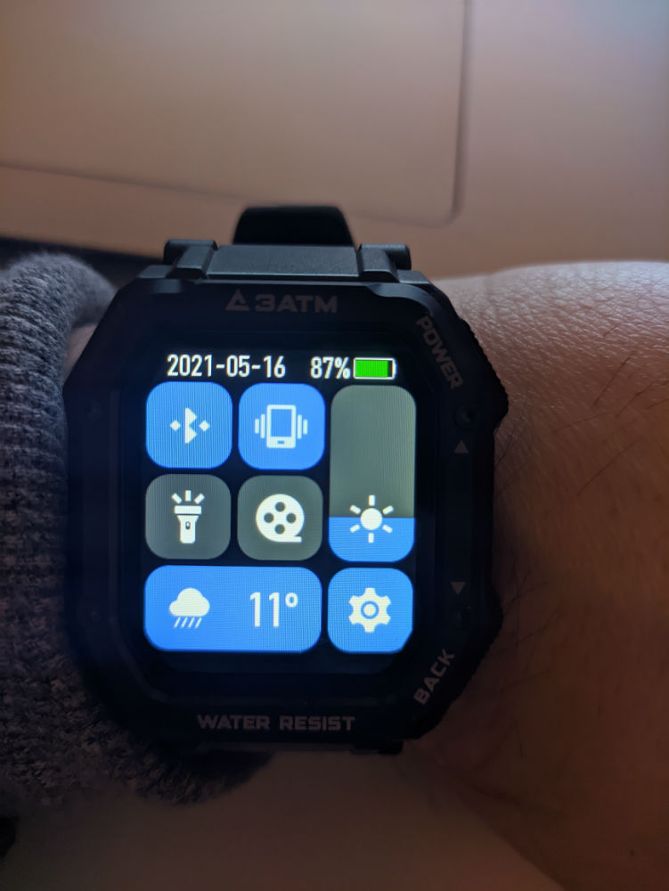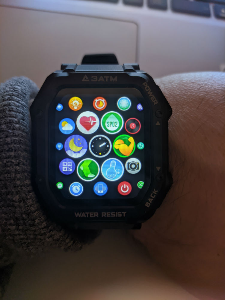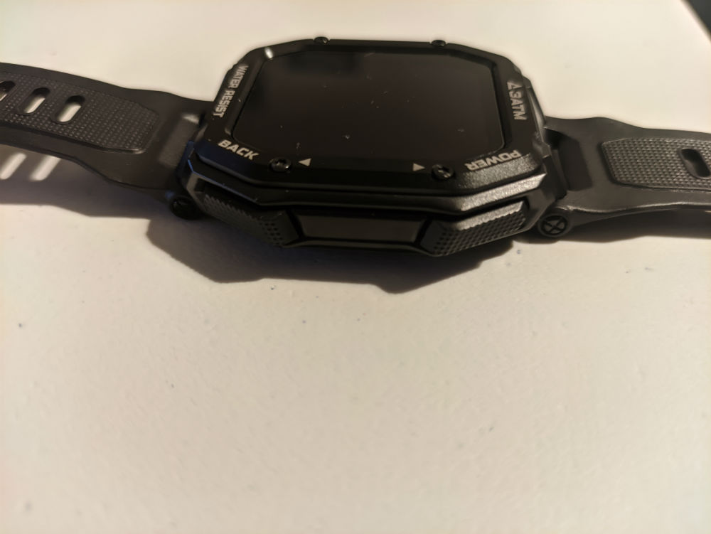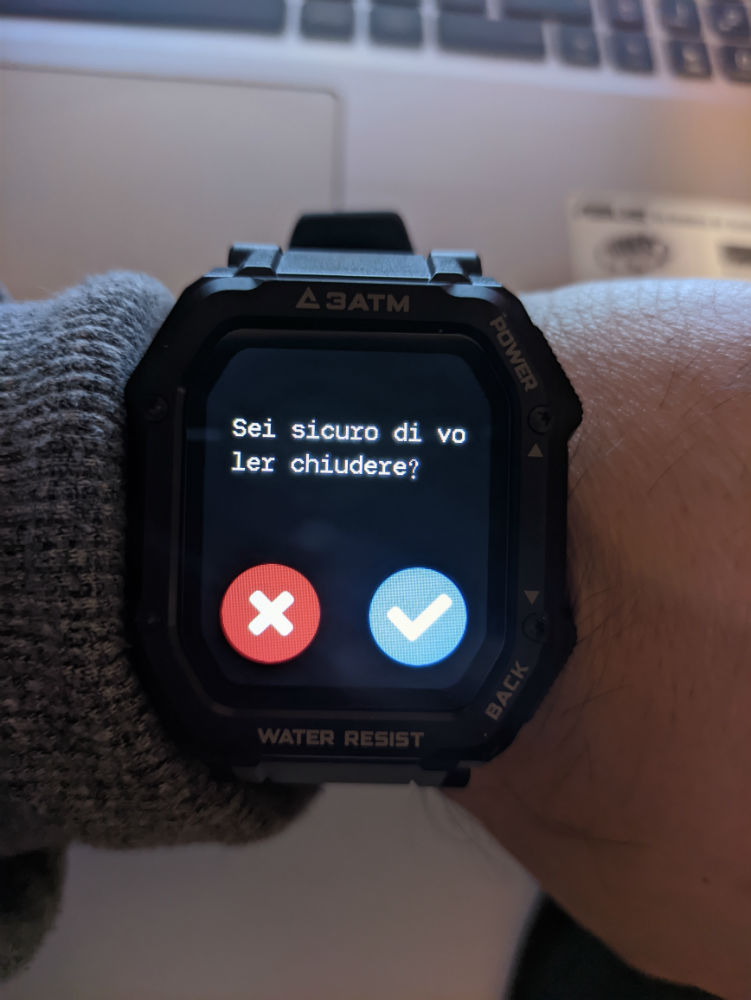 Lo schermo di Kospet Rock è TFT LCD a colori da 1.69”, un po’ più grande della media ma molto comodo per chi ha problemi di vista, con il movimento del polso o toccando uno dei due pulsanti tra Power e Back, si attiverà lo schermo e sarà possibile vedere orario, più altre informazioni in base alla watchface scelta.